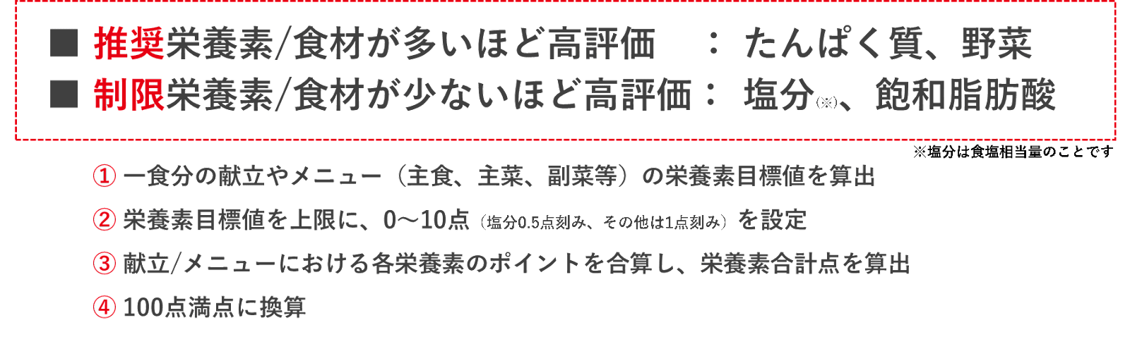 この「ツジツマシアワセ」の根拠となるロジックとして、日本の文化に適した栄養素プロファイリングシステム「JANPS(Japan Nutrient Profiling System)」を用いて、健康寿命延伸に関連する4つの栄養素・食材に着目し、食品中に含まれる栄養成分(Nutrient)の量を科学的な根拠に基づいて評価することで、献立・メニューの栄養素評価指標としています。