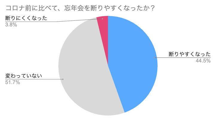 「コロナ前に比べて、忘年会を断りやすくなったと感じるか?」という質問に対し、44.5%の人が「断りやすくなった」と回答しています。これは、健康や感染への懸念、またはリモートワークや非対面のコミュニケーションが普及したことで、従来の社内の慣習や価値観が変わりつつあることを示しています。また、コロナ禍により、個人の意向や健康を尊重する風潮が強まっている可能性も考えられます。