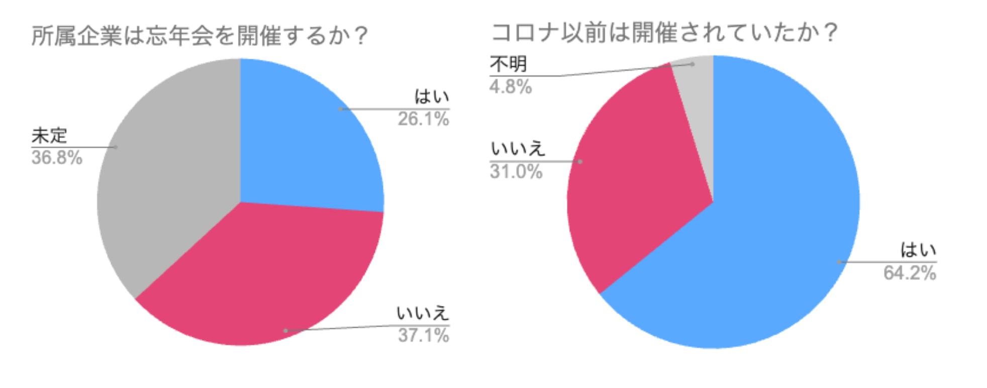 今年の企業の忘年会の開催状況は「いいえ(37.1%)」と回答した人が最も多く、続いて「未定(36.8%)」、そして「はい(26.1%)」という順番となっています。コロナ以前には忘年会が開催されていたと答えた人が64.2%となっており、コロナ前ほど開催されないと言えるでしょう。(アンケートは2023年10月中旬に行ったこともあり、未定の割合が多くなっています。)
