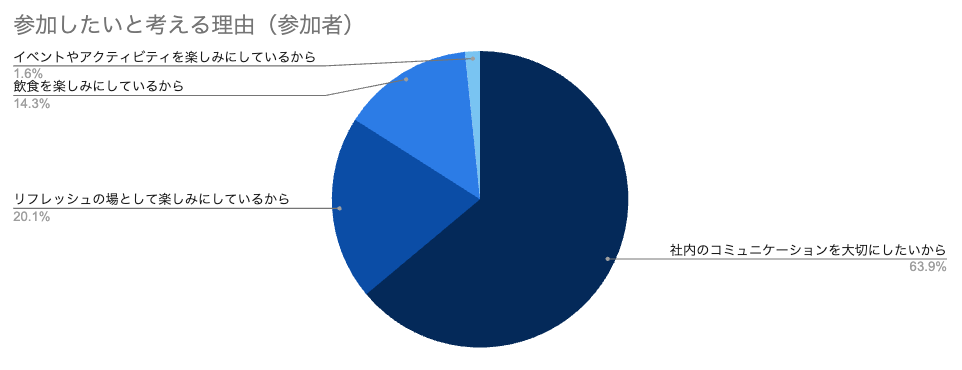 忘年会に参加したくて実際に参加する人たちの動機を見ると、多くの人々が「社内のコミュニケーションを大切にしたいから」と回答しており、その割合は63.9%となっています。これは、多くの従業員が忘年会を通じての人間関係の構築や深化を重視していることを示しています。