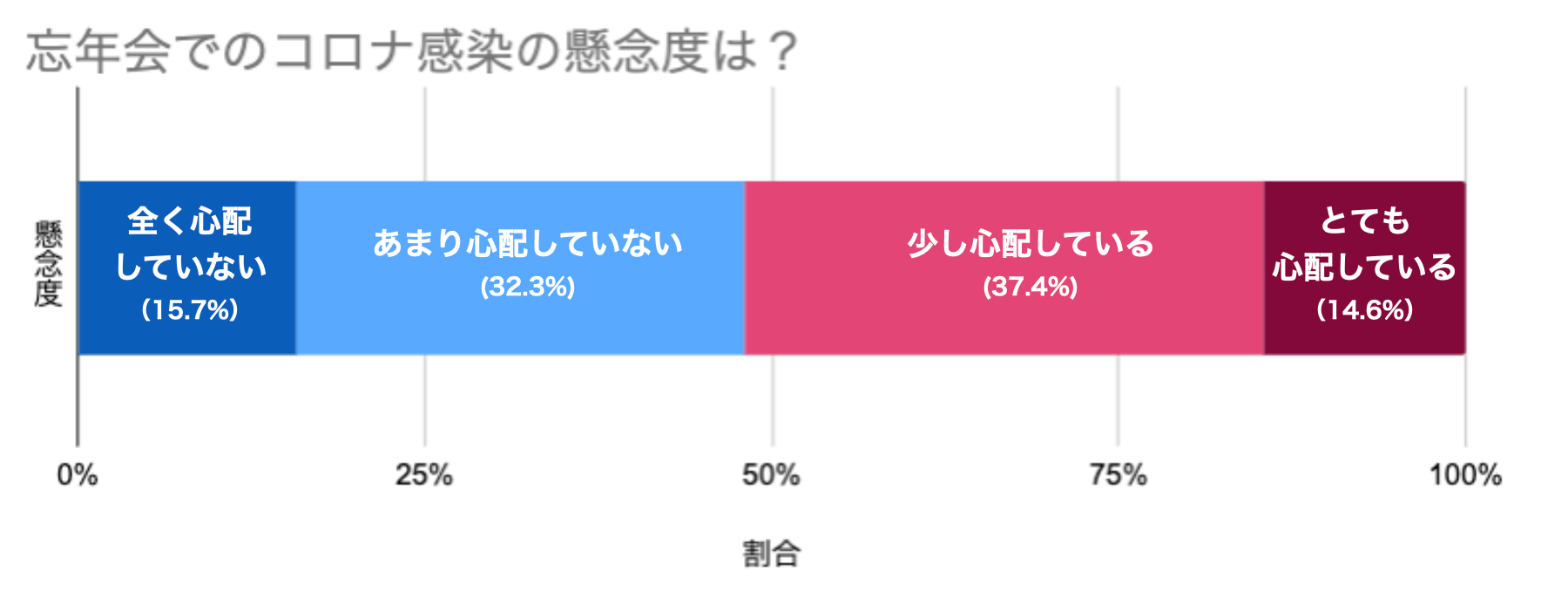 忘年会でのコロナ感染を心配しているのは、52.0%であることがわかりました(「とても心配している(14.6%)」と「少し心配している(37.4%)」の合算)。これは、多くの人々が今もなおコロナウイルスの感染リスクを捉えていることを示しており、社内イベントや集まりに対しての警戒心や懸念が依然として存在していることがうかがえます。