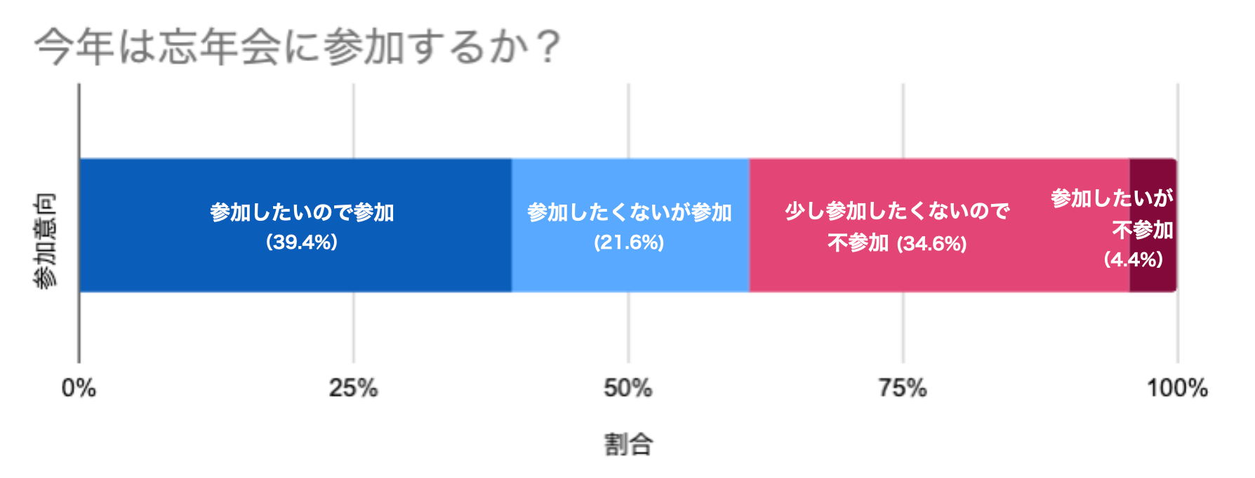 今年の忘年会に関して、「参加(61.0%)」、「不参加(39.0%)」となっています。中でも、21.6%の人々が自分の意志に反して参加することが明らかとなりました。