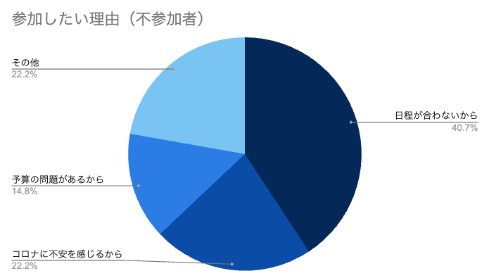 最も多く挙げられた理由は「日程が合わないから」であり、その割合は40.7%となっています。これは、多くの人が職務やプライベートの予定との兼ね合いで忘年会への参加が難しいと感じていることを示しています。