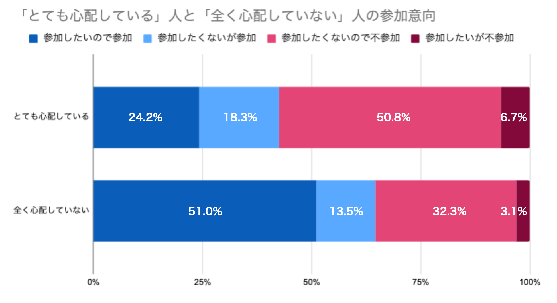 感染を「とても心配している」人でも、24.2%が「参加したいので参加」と回答し、さらに18.3%が「参加したくないが参加」と回答。強い懸念を抱えているにもかかわらず、社会的な圧力や義務感、仕事上の理由などが強く影響する。