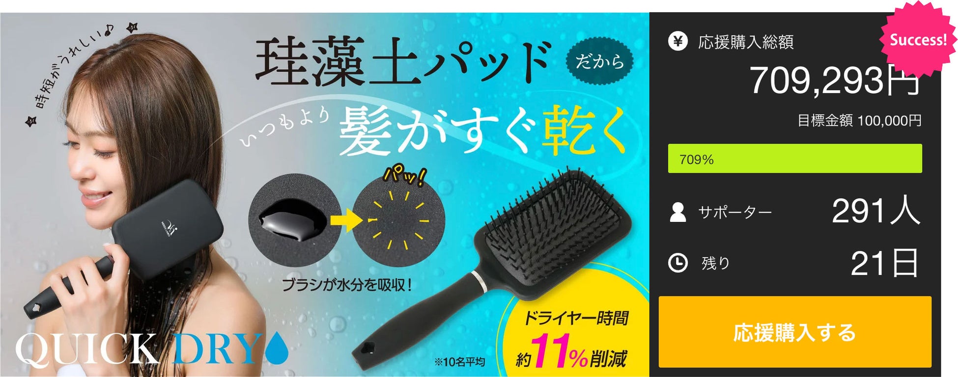 【マクアケ新プロジェクト700%越達成!】濡れ髪速乾!珪藻土入り吸水素材が新しいブラシ!めんどうなドライヤーの時間を短縮♪
