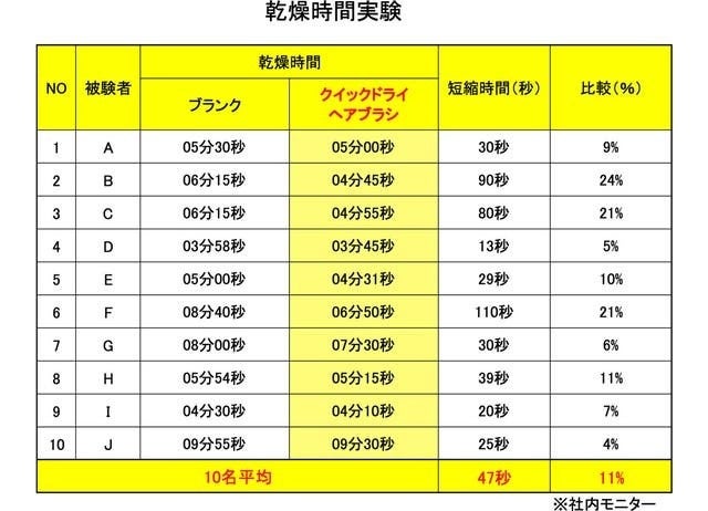 • 10名で社内モニターを実施!髪の毛が乾く時間が平均約11%短縮!