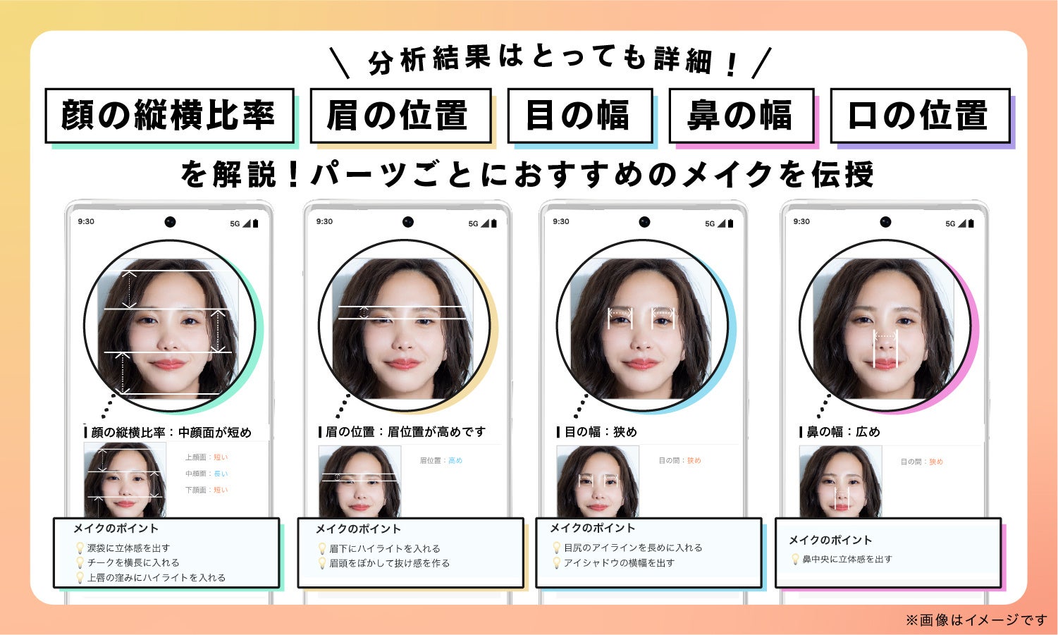 目の位置や鼻の位置など、パーツごとのバランス分析はもちろん、LIPSアプリ内で「パーソナルカラー診断」を受けたことのある方には、ご自身のパーソナルカラーと連動したおすすめのメイク法などもレコメンドいたします。