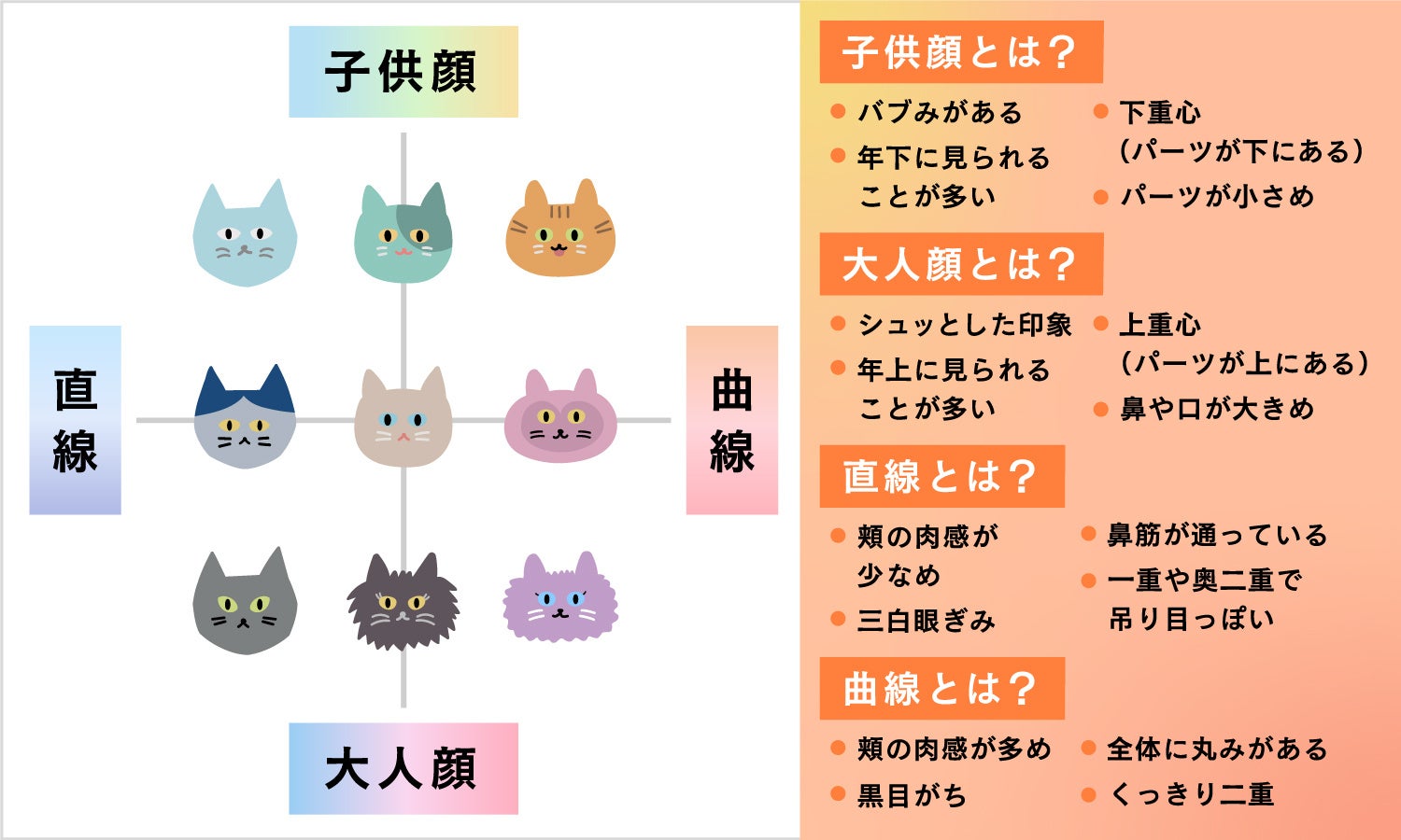 診断の大きな要素となる「子供顔」「大人顔」「直線」「曲線」の要素は、見た人の印象ではなく、目や鼻、口といったパーツの配置や奥行き、バランスや大小などをスコア化。