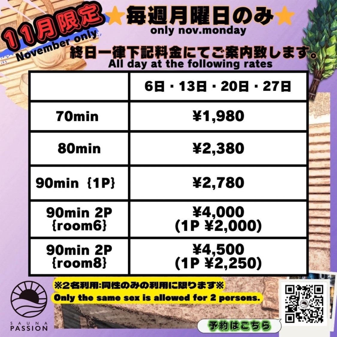 4.毎週月曜日(11/6,13,20,27)のみ終日各部屋最安値でサウナ利用が可能!!