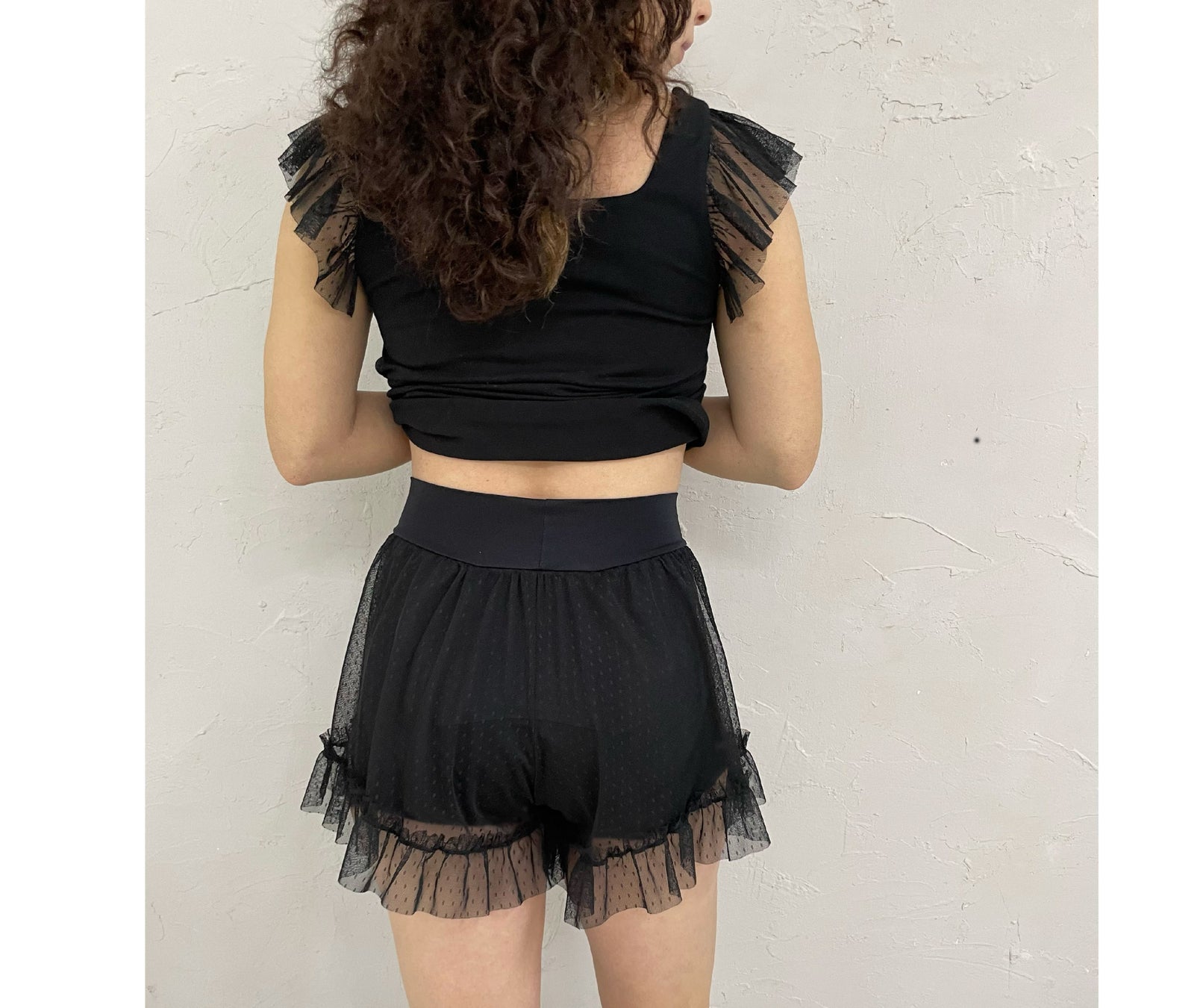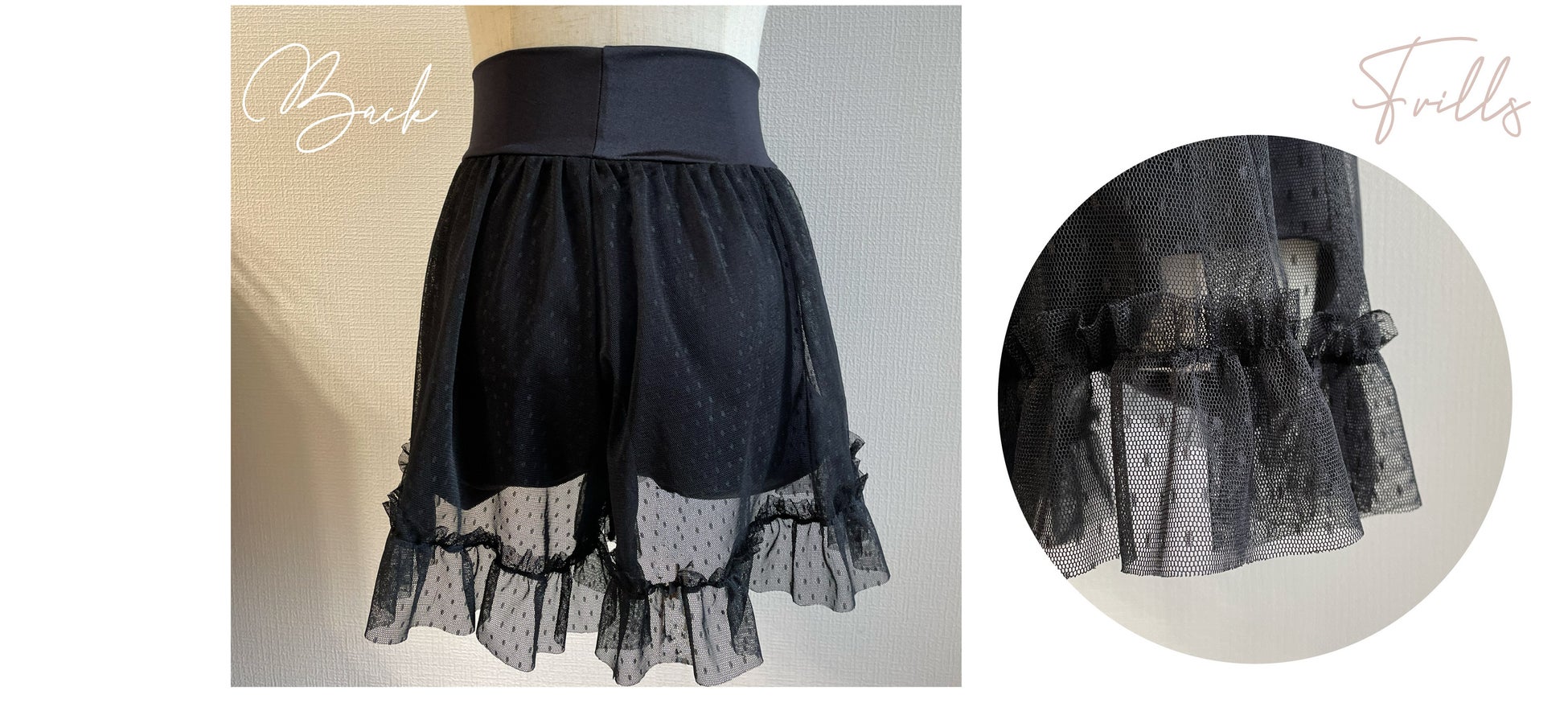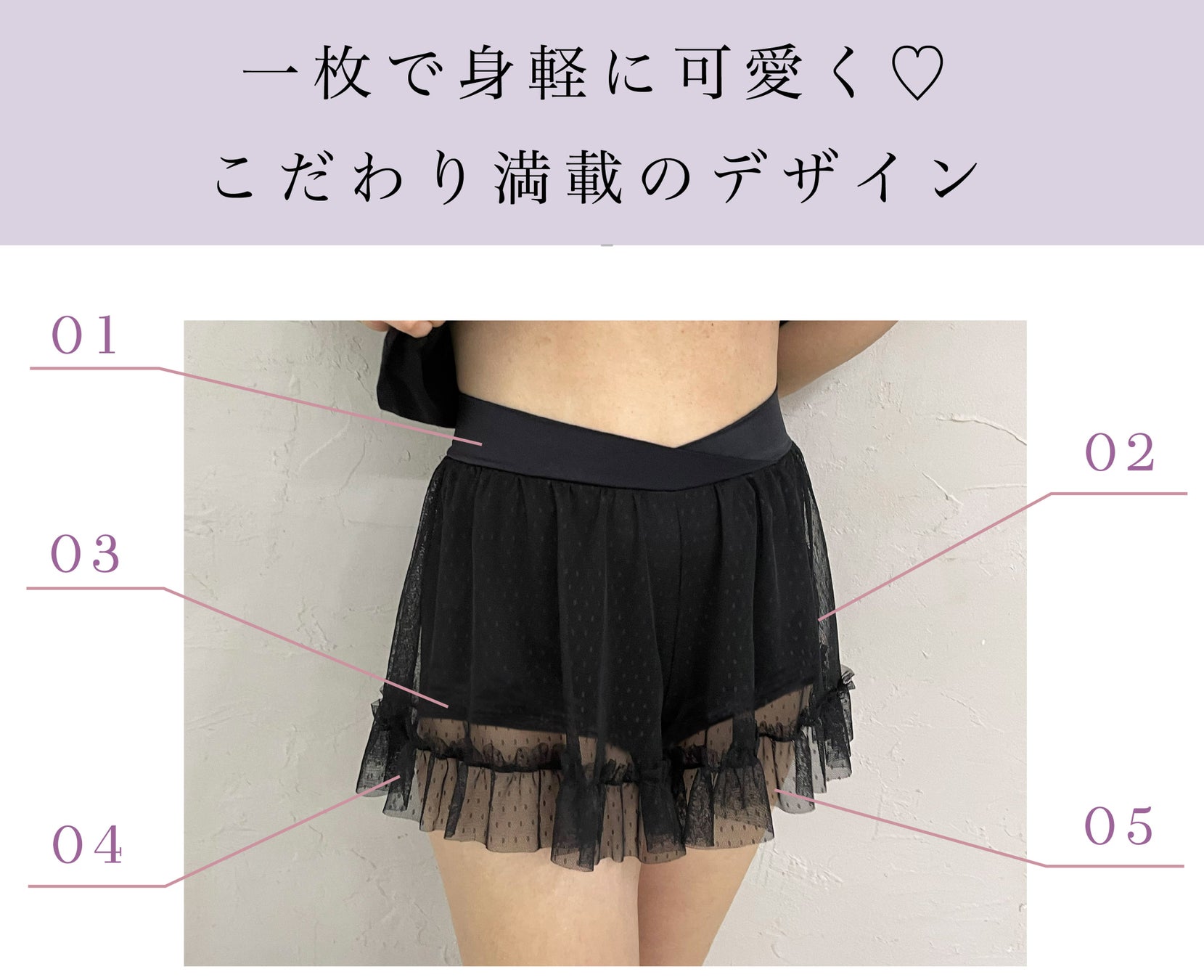 Ponit ④:贅沢にあしらった裾のフリルが、気になる太もも周りをカバー。