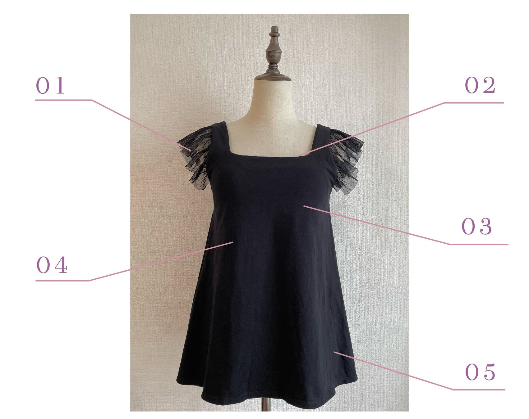 Ponit ①:肩部分のフリルが、気になる二の腕を可愛くカバーしてくれます。
