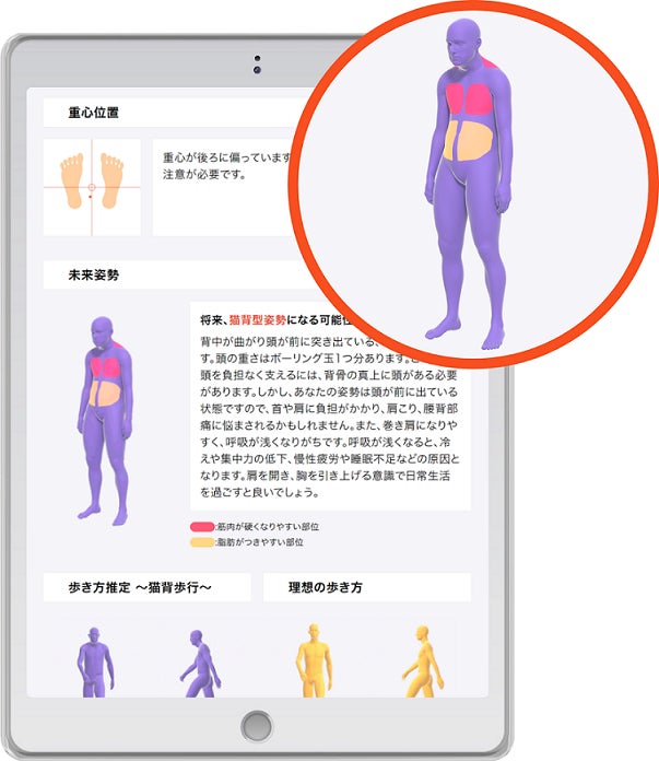 最先端のAI技術を用いた姿勢分析システムにより、重心の偏りや前後左右のゆがみなど、姿勢に関する詳細を数値で評価します。またゆがみの原因となる部位を3Dアバターで分かりやすく可視化するので、普段なかなか客観視できない自分の姿勢について、多くの気づきを得ることができます。