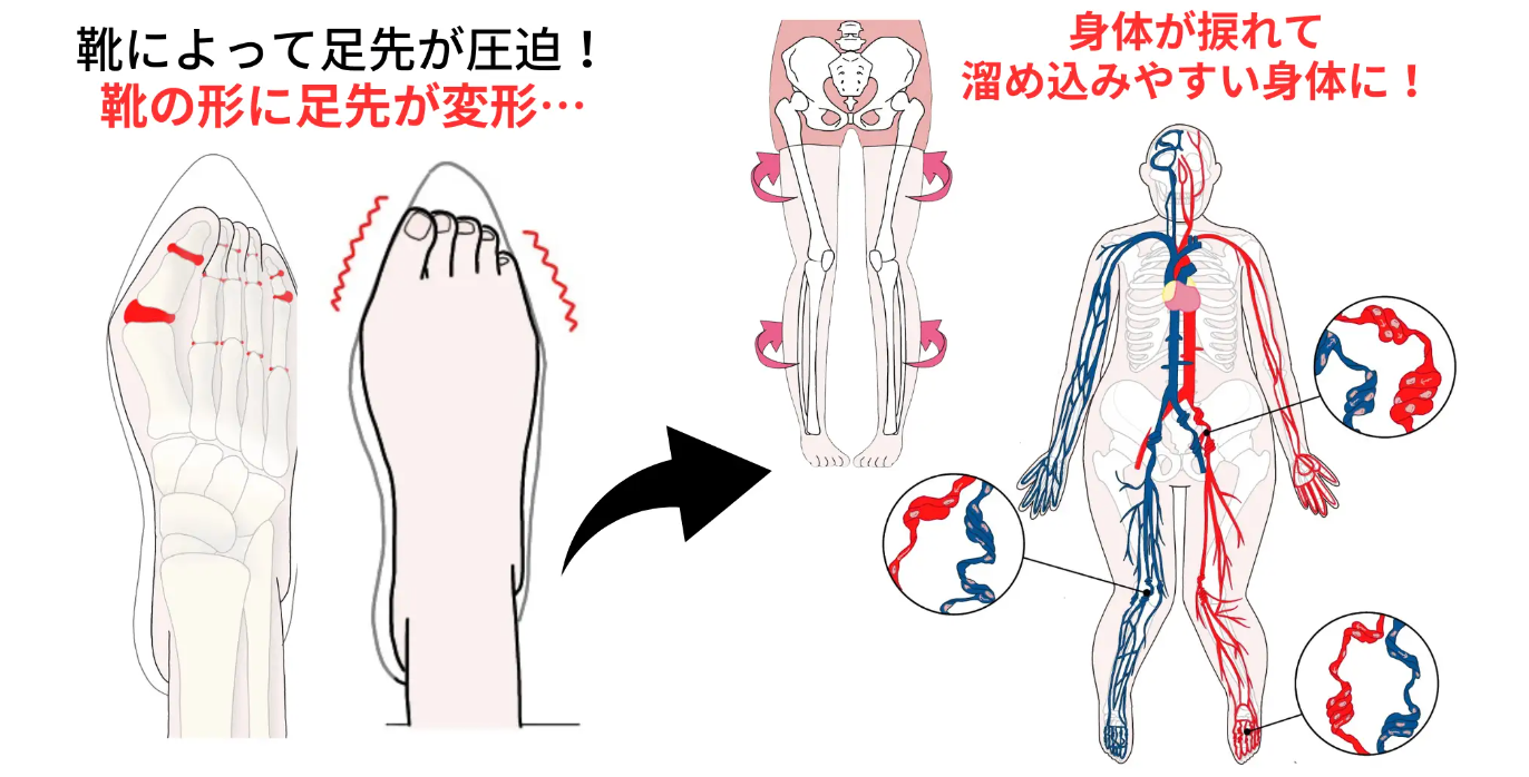 足は立ったり、歩いたりするために全身の体重を支える部位になります。ただ、靴を履くことにより足はギュッと圧迫されやすくなってしまうため、本来の足の状態が保てなくなってしまいます。特に女性はヒールなどでより足先に圧がかかるため、親指はねじ曲がるなど指先や足の甲までもが歪みやすく、その足の歪みにより歩き方に癖が出ることで、O脚はもちろん骨盤の歪みや首肩の凝り、ましてやエラ張りや頬骨の突出など顔をパンパンに膨らませてしまう可能性があると言われています。