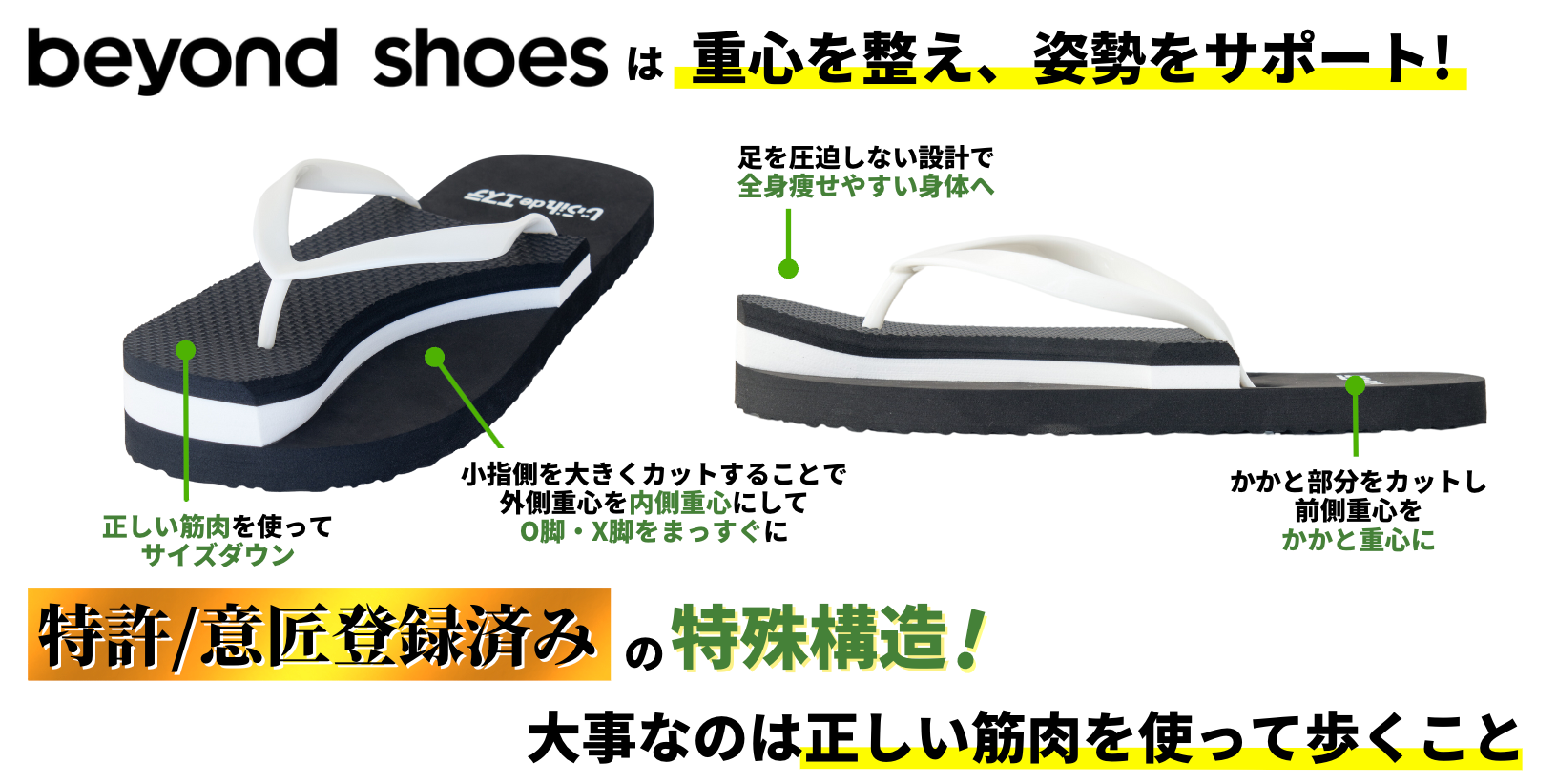 まずは根本であるその癖づいてしまった歩き方を改善すべく、作られたのがこちらの「beyond shoes」です。
