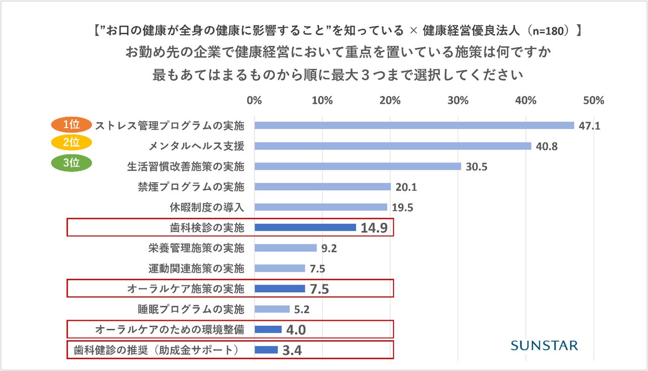 ③“お口の健康が全身の健康に影響すること”を知っている健康経営優良法人でも、健康経営において重点を置いている施策のトップ3にオーラルケア関連施策がランクインしていない