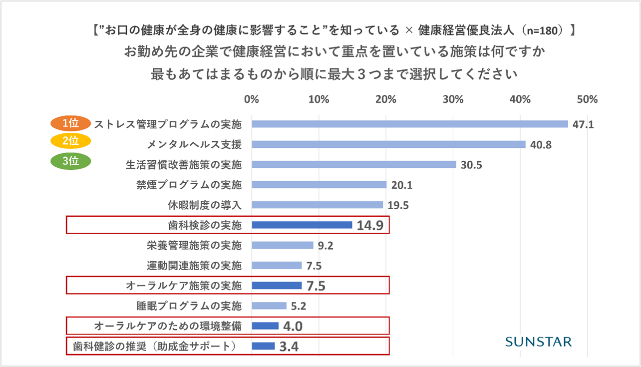 ③“お口の健康が全身の健康に影響すること”を知っている健康経営優良法人でも、健康経営において重点を置いている施策のトップ3にオーラルケア関連施策がランクインしていない