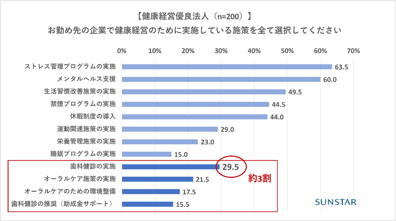 オーラルケア関連施策の実施率は、「歯科健診の実施」29.5%、「オーラルケア施策(※5)の実施」21.5%、「オーラルケアのための環境整備(※6)」17.5%、「歯科健診の推奨(助成金サポート)」15.5%と、いずれも3割以下となっており、健康経営優良法人であっても、オーラルケア関連施策の実施率は総じて低いことがわかります。