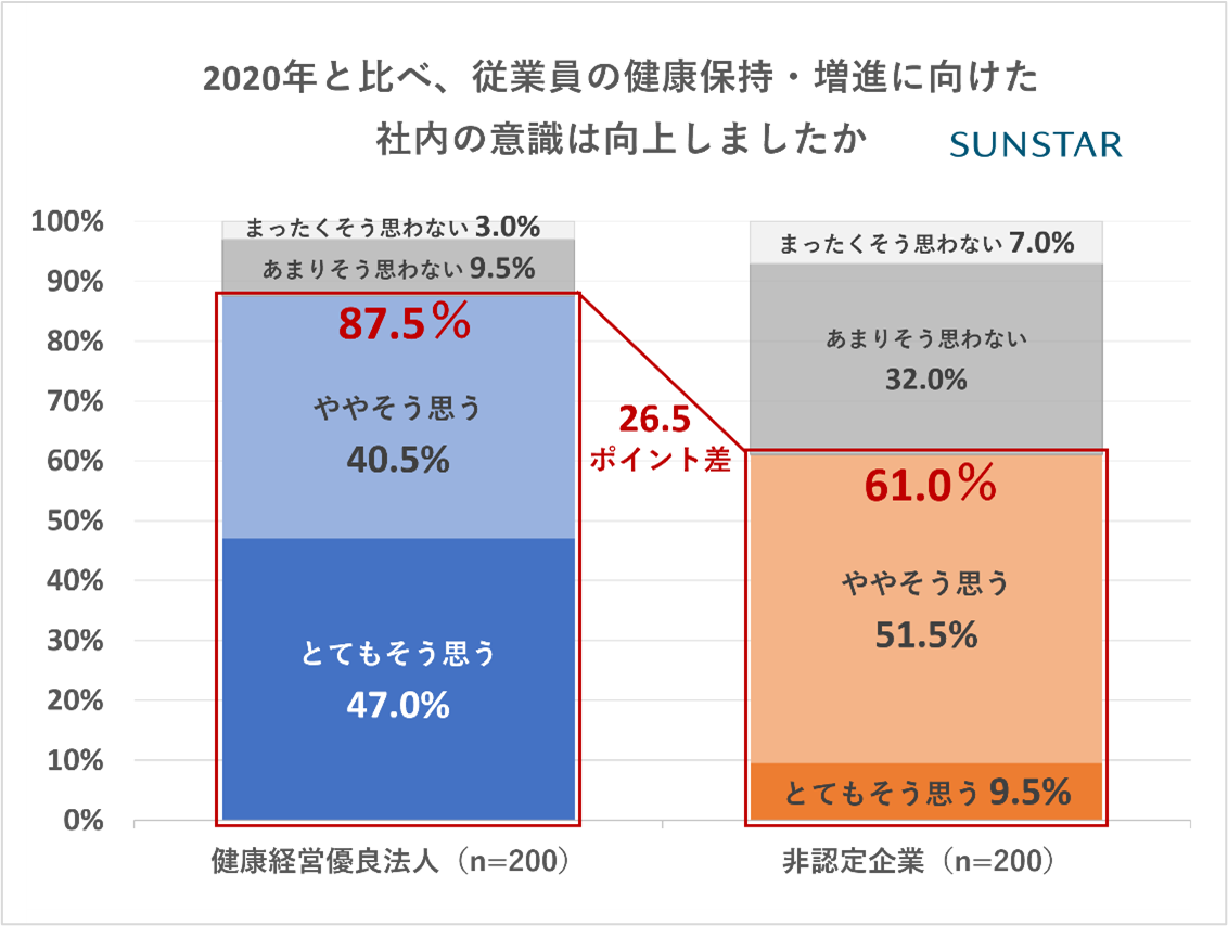 ①健康経営優良法人では、2020年と比べ、人事・総務担当者の約9割(87.5%)が“従業員の健康保持・増進に向けた社内の意識が向上した”と感じている一方で、非認定企業では6割(61.0%)にとどまり、26.5ポイントの差に