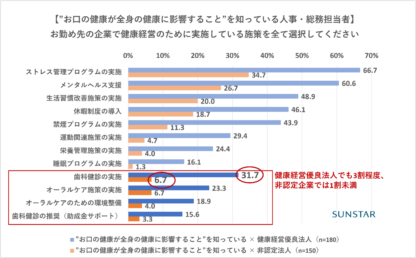 また、“お口の健康が全身の健康に影響すること”を知っている人事・総務担当者の回答に限定しても、会社の健康診断で歯科健診を実施しているのは、健康経営優良法人で約3割(31.7%)、非認定企業では1割未満(6.7%)であることがわかりました。人事・総務担当者の意識とオーラルケア関連施策の実施状況に乖離があることがわかります。