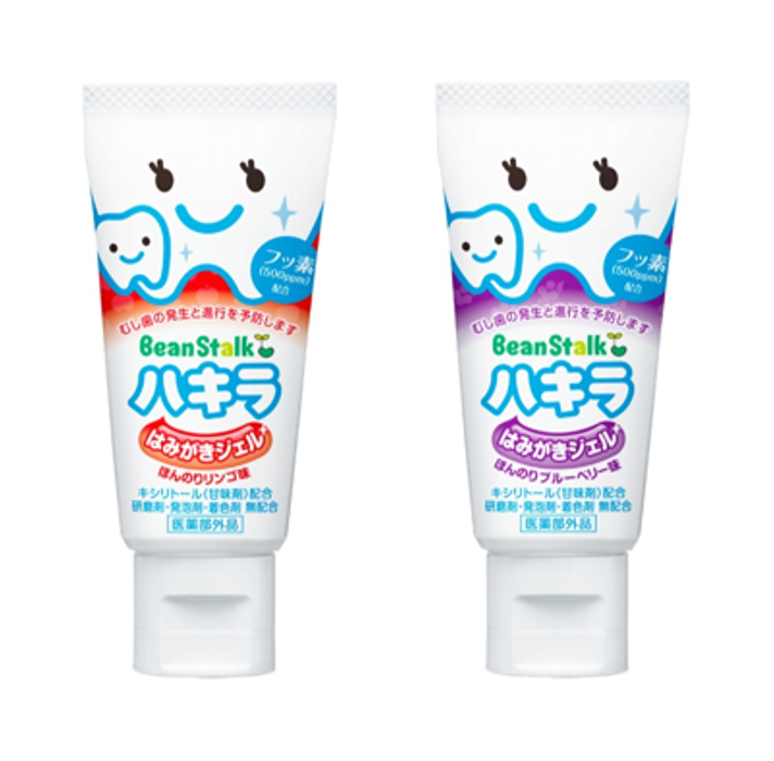 「ビーンスターク ハキラ」全6品(オレンジ、リンゴ、ブルーベリー、ラムネ、ブドウ、イチゴ)、「ビーンスターク ハキラ おためしアソート3つの味」「ビーンスターク ハキラ はみがきジェル」全2品(ほんのりリンゴ味、ほんのりブルーベリー味)