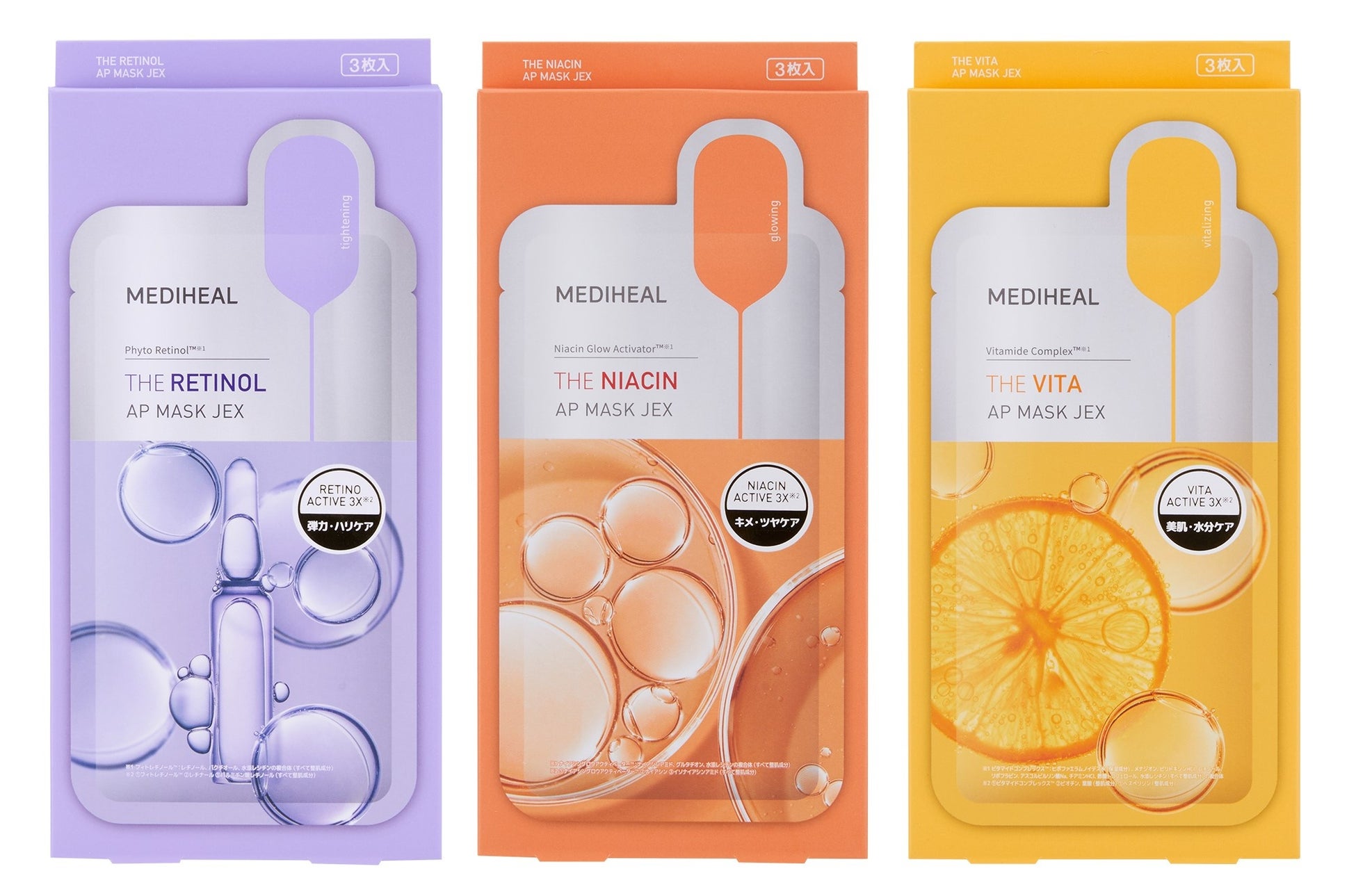 保湿ケア、肌荒れ防止ケア、毛穴ケア※3ができる既存の3種類に加え、弾力ケアの「THE レチノール APマスクJEX」、肌キメケアの「THE ナイアシン APマスクJEX」、水分チャージケアの「THE ビタ APマスクJEX」が新登場。肌悩みに合わせてお選びいただけます。