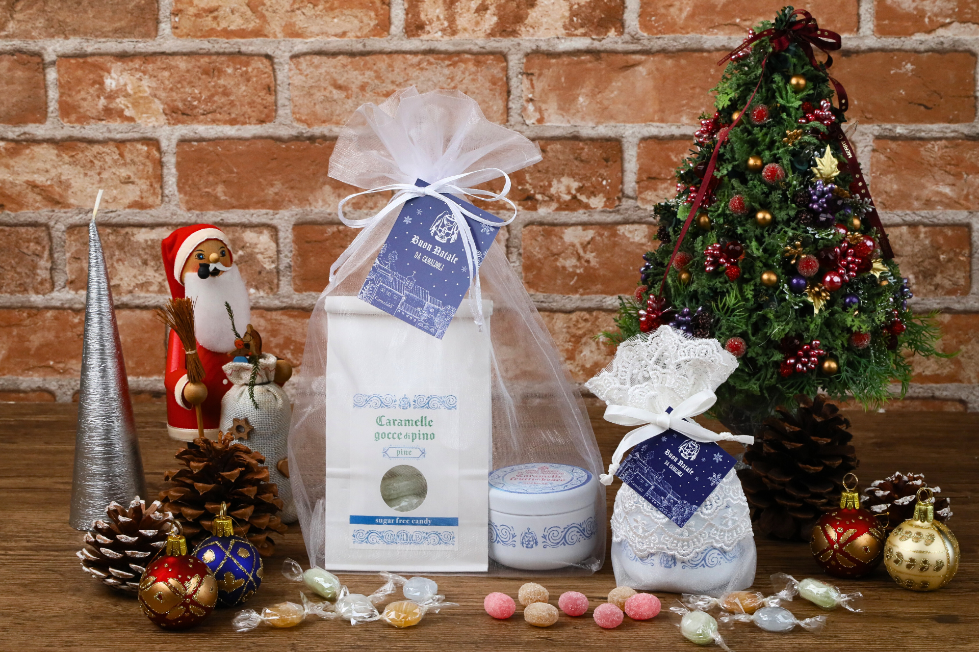 そんな伝統のキャンディが詰められたボンボニエーラ※缶を優しく包む、オリジナルのギフトラッピングが登場します。限定タグ付きで、皆様にクリスマスの祝福を届けます。