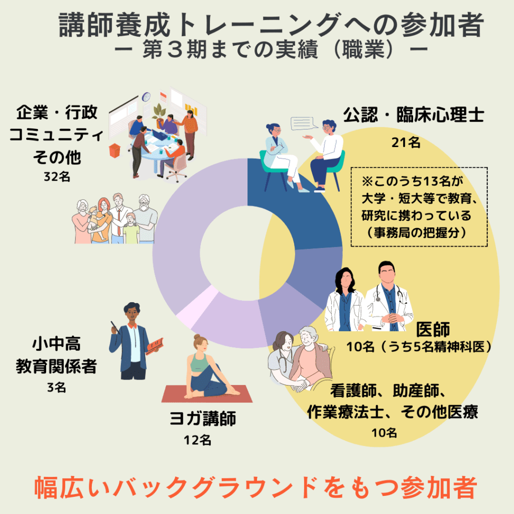 日本国内の、医療、教育、企業など様々な専門分野を持つプロフェッショナルと、同じメンバーで1年半学ぶことにより、マインドフルネスをともに学び、教えるためのコミュニティを形成することが可能となります。