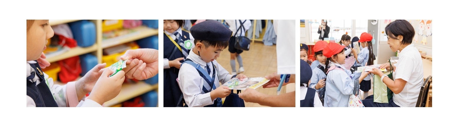 光塩女子学院日野幼稚園での配布当日の様子。歯磨きの大切さやキシリトールのお話しの後、先生から子どもたちにプレゼント。みんな興味津々で「早く食べたい!」と声が上がっていました。