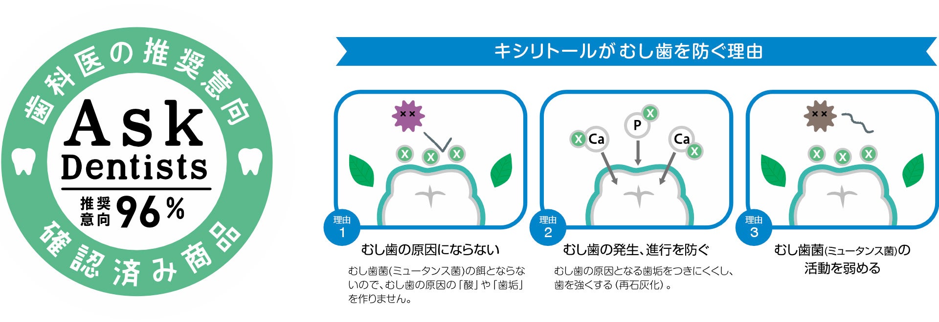 キシリトールの原料は、白樺や樫の木から作られる天然甘味料です。砂糖と同じくらい甘いのに、糖類0、カロリーは砂糖の75%程度。世界各国の長期に渡る研究で、むし歯の予防効果があると認められた甘味料です。市販品にはキシリトール以外の原材料も多く含まれた配合商品がありますが、本製品はフィンランド産キシリトール100%を丸ごと固め、その配合率にもこだわりました。100名以上の歯科医が評価を行い一定の基準を満たした場合にのみ認定される、Ask Dentistsマークを取得しています。