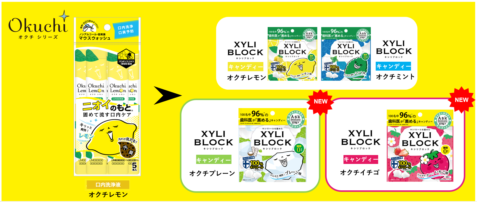 キシリブロックは、ベストコスメを受賞しているオーラルケアブランド「オクチシリーズ」から生まれたキシリトール100%(※1)キャンディーです。大ヒット商品のマウスウォッシュ『オクチレモン』は、口臭の原因を固めて流す(※2)ギミックと豊富なフレーバー展開が好評を博し、シリーズ累計出荷総数1億2200万本を突破。