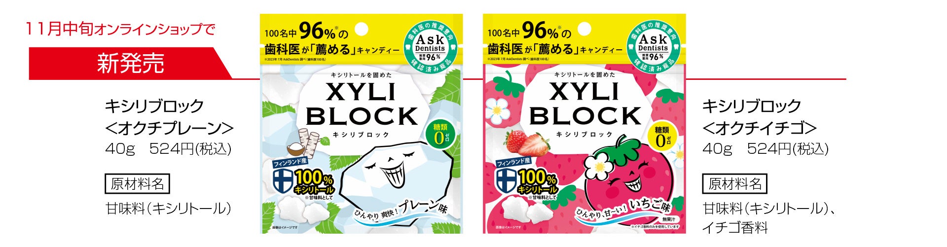 歯みがきの仕上げとしてキシリブロックを子どもたちに与えているリピーターが多いことから、同社では「子どもから歯みがきを催促される、そんな仕上げの一粒になれば」との思いで新フレーバーを企画。子どもたちに人気のいちご味と、香料ゼロこだわりのプレーン味が11月中旬に発売されます。「美味しいのにオクチにいい」そんなオーラルケアを楽しく続けられる商品づくりを目指します。