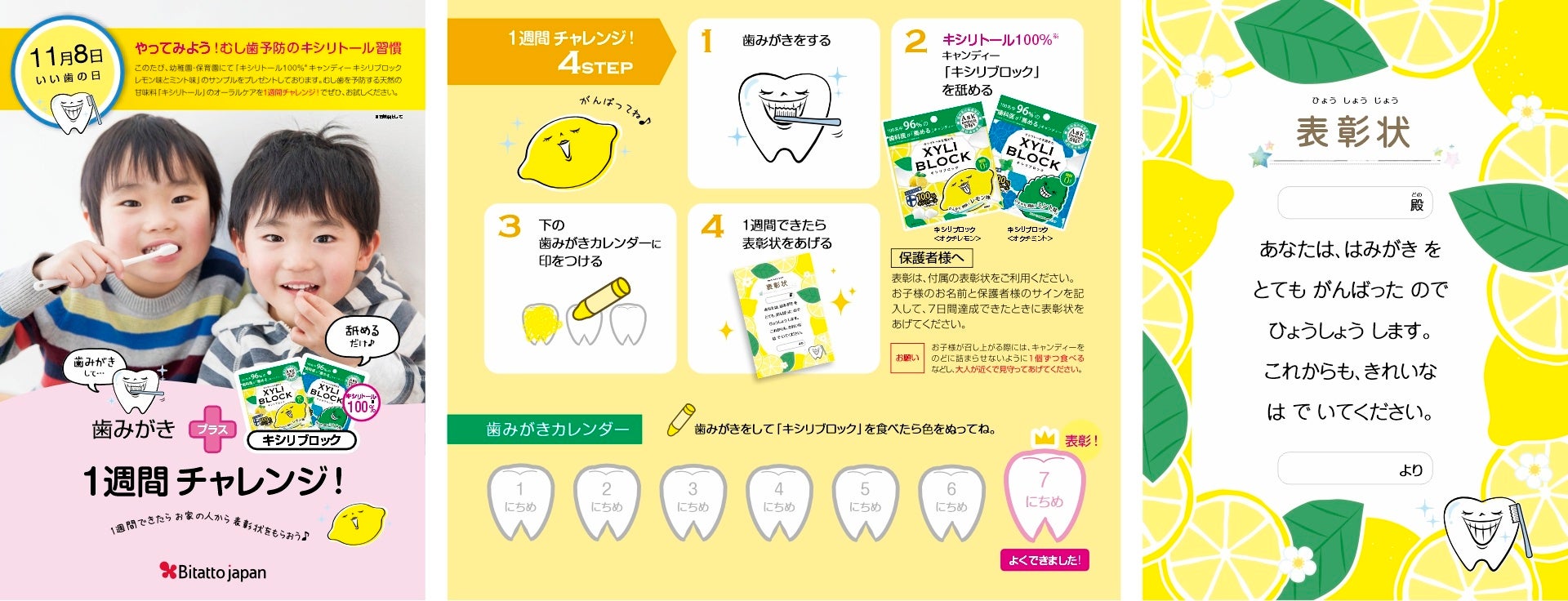 本企画は、歯磨き習慣が身についていない園児が対象。毎日の歯磨き後に「キシリブロック」を舐めるだけというチャレンジをしてもらい、1週間達成できたらご家族から表彰状のプレゼントが渡されます。