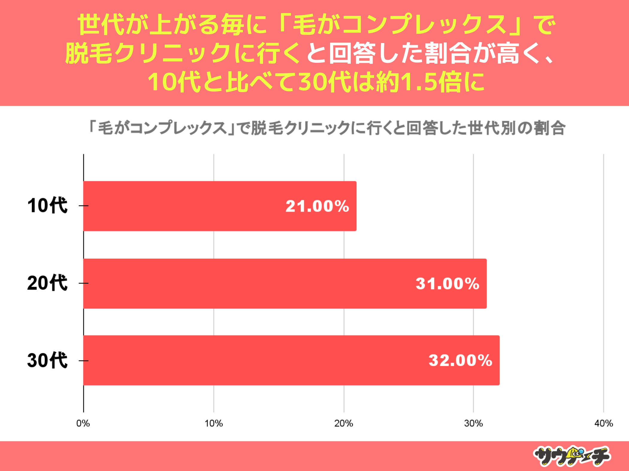 「毛がコンプレックス」で脱毛クリニックに行くと回答した割合を世代別でみてみますと、30代の32%が最も高く、次いで20代の31%10代が21%で、10代と比べて30代は約1.5倍高いという結果になりました。