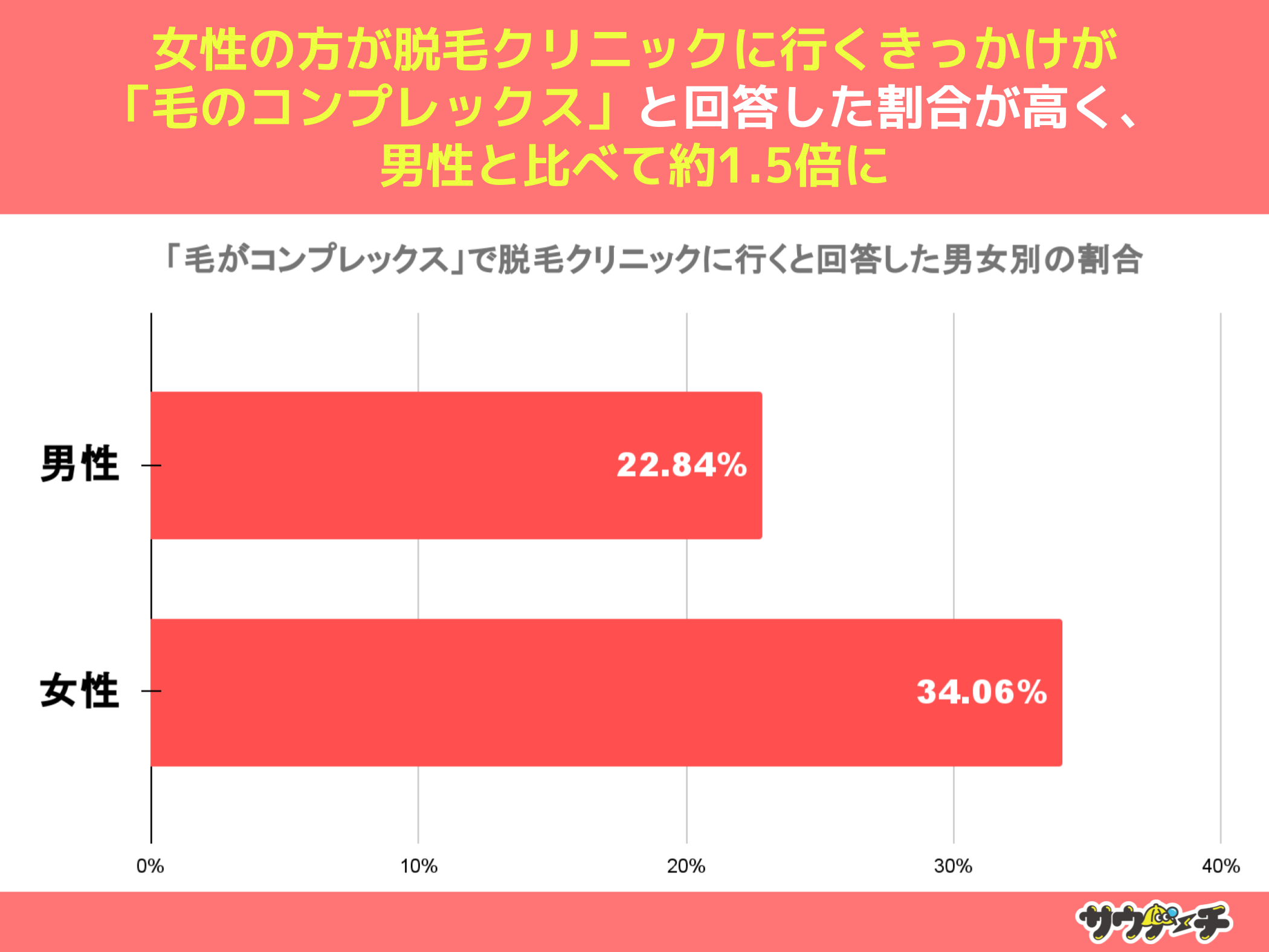 脱毛クリニックに行くきっかけが「毛のコンプレックス」と回答した割合を男女別でみてみますと、男性が22.84%女性が34.06%と、男性より女性の方が約1.5倍高い結果となりました。