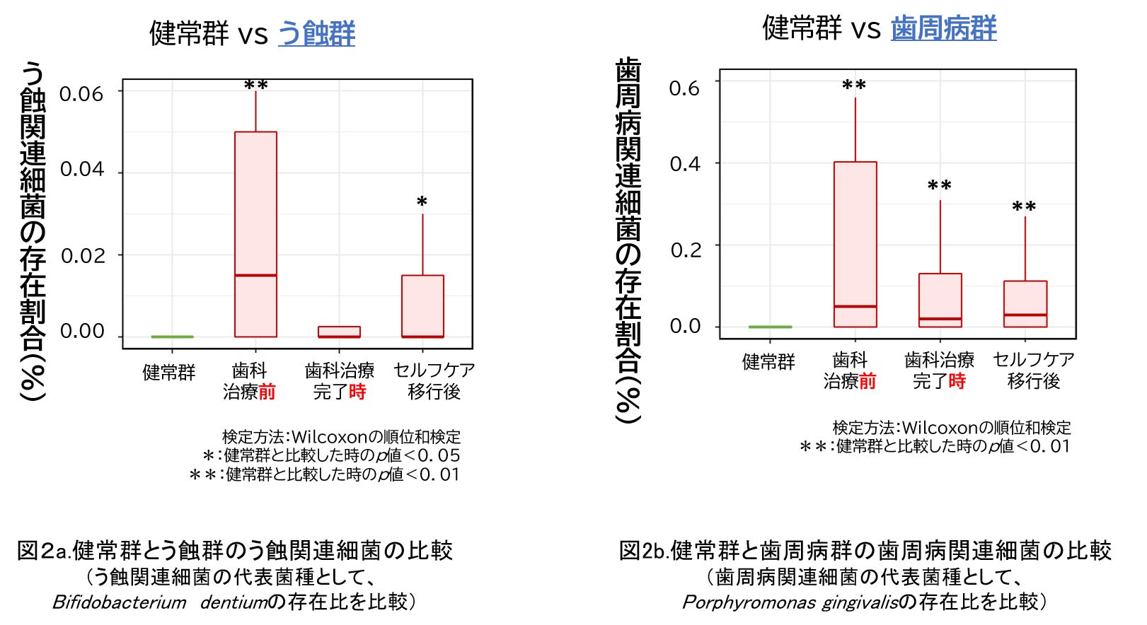 (2)う蝕・歯周病群は歯科治療後も、う蝕・歯周病に関連する細菌(※10)の割合が健常群より多いことを解明