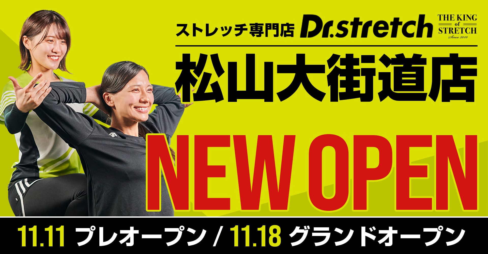 Dr.stretch松山大街道店は、伊予鉄道「大街道駅」から徒歩2分の場所にある好立地。今年3月に愛媛県初出店となった松山市駅前店に続き、早くも2号店がオープンいたします。