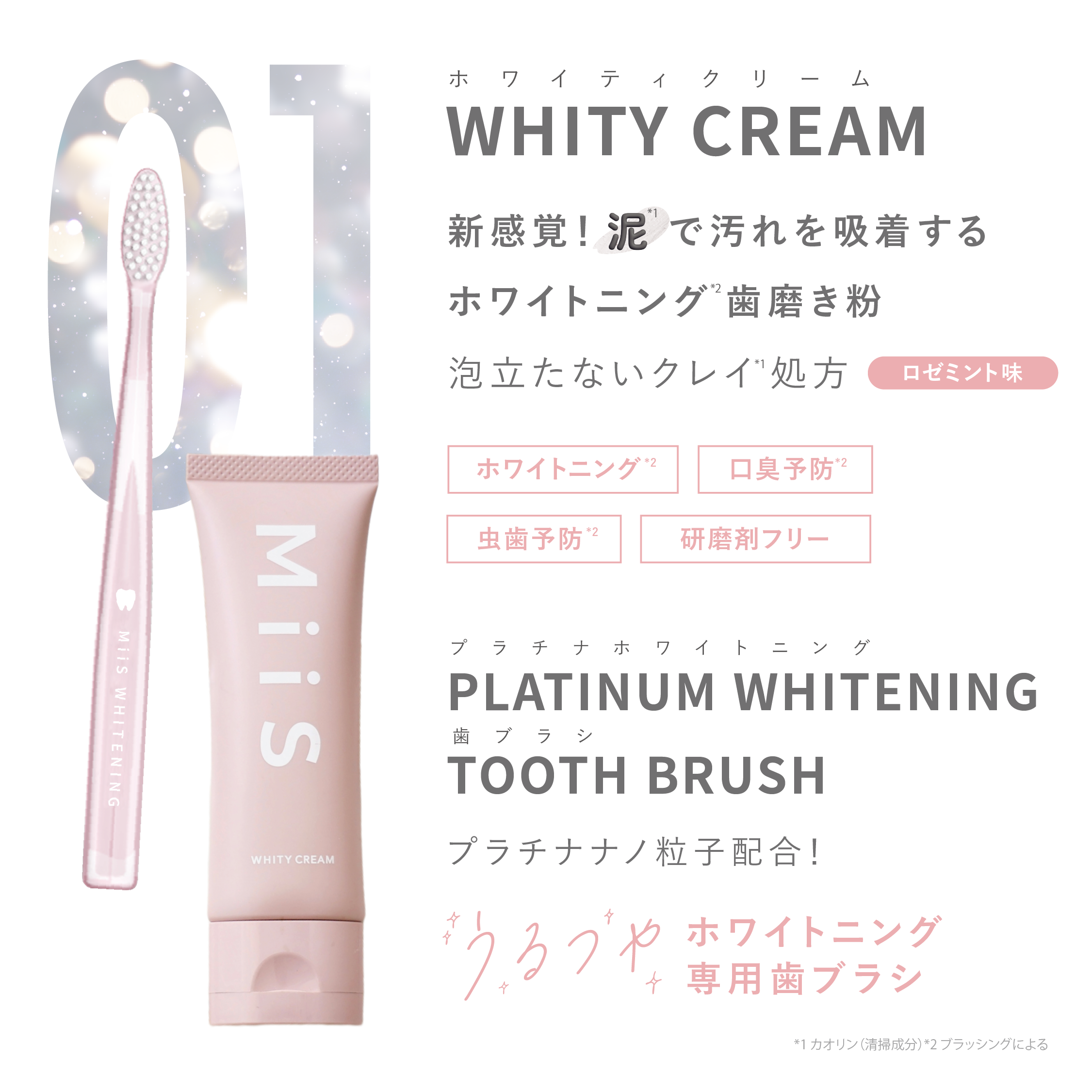 MiiSの代表商品である歯の美容液「ホワイティエッセンス」や人気の美白(*1)歯磨き粉「ホワイティクリーム」、口内環境を整えるCICA(*2)配合のマウスウォッシュ「ブレスエッセンス」、ホワイトニング専用歯ブラシ「プラチナホワイトニング歯ブラシ」をセットにしました。