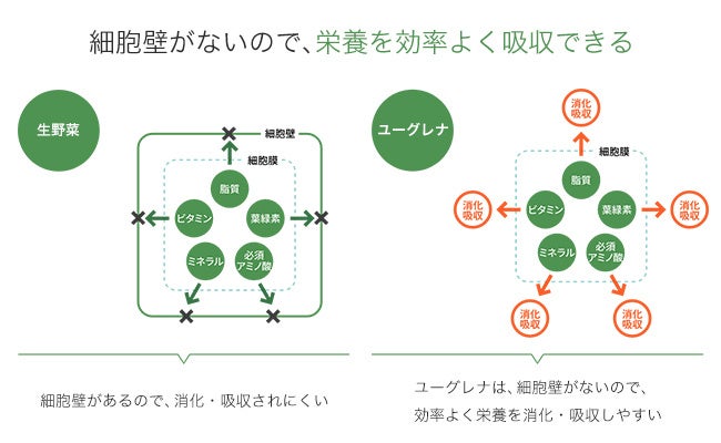 またユーグレナは野菜などに本来ある「細胞壁」をもたないことから、栄養素の消化・吸収がされやすいため