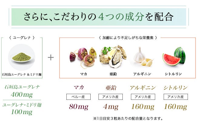 配合量:ユーグレナ400mg、ミドリ麹100mg、マカ80mg、亜鉛4mg、Lアルギニン160mg、Lシトルリン160mg(1日目安3粒あたりの含有量)