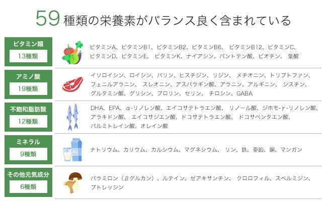ビタミンB群やビタミンEを始め、特有成分であるパラミロンを含めて59種類もの栄養素を含んでいる理想的な天然の食品です。