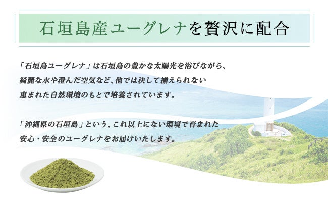石垣島の恵み健やかユーグレナはその名の通り、石垣島の豊かな太陽光を浴びながら綺麗な水や空気に囲まれた環境で生まれた、石垣島産ユーグレナを使用しています。