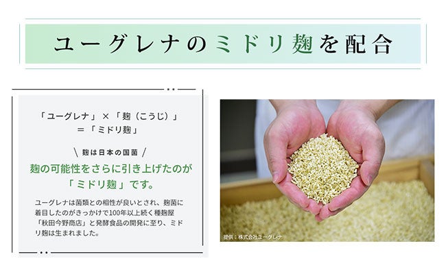 豊富な栄養素を持つ「ユーグレナ」と、日本の食生活を長年支えてきた「麹(こうじ)」を組み合わせ、秋田で生まれたプレミアムな麹が「ミドリ麹」です。