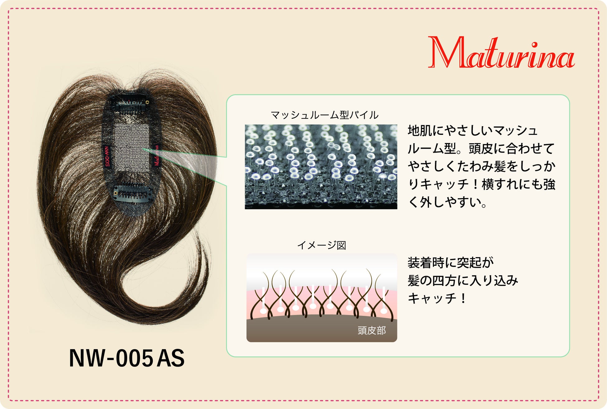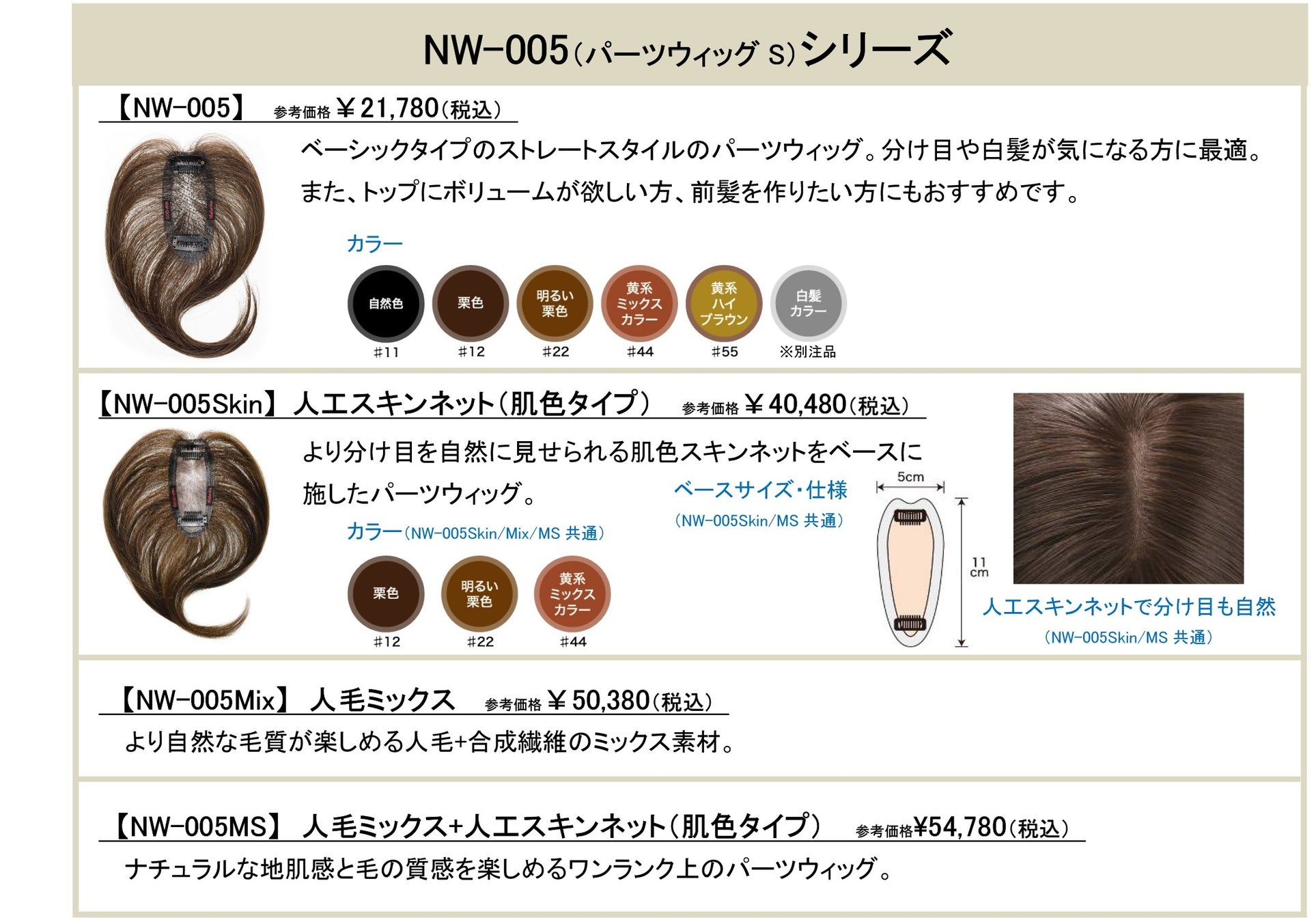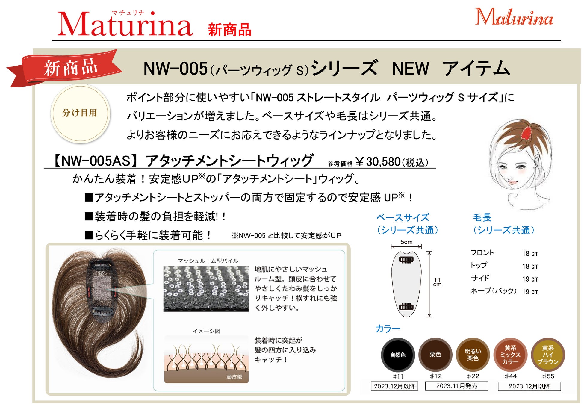パーツウィッグは気になる分け目を手軽にカバーでき、薄毛や白髪カバーなどのお悩み解決だけでなく身支度の時短アイテムとしてもご活用いただける、ウィッグデビューにも最適な商品となります。今回発売する「NW-005AS」が仲間入りしたことでNW-005シリーズは全5型19SKUとバリエーションが増え、さらにお客様のニーズにお応えができるようになりました。ベーシックな「NW-005」。分け目をより自然に見せる肌色スキンネットがベース全体に施されている「NW-005Skin」。より自然な毛質が楽しめる人毛と合成繊維のミックス素材である「NW-005Mix」。ナチュラルな地肌感と質感が楽しめるワンランク上のパーツウィッグ「NW-005MS」。使う方のシーンに合わせ、より生活に密着した商品ラインナップです。