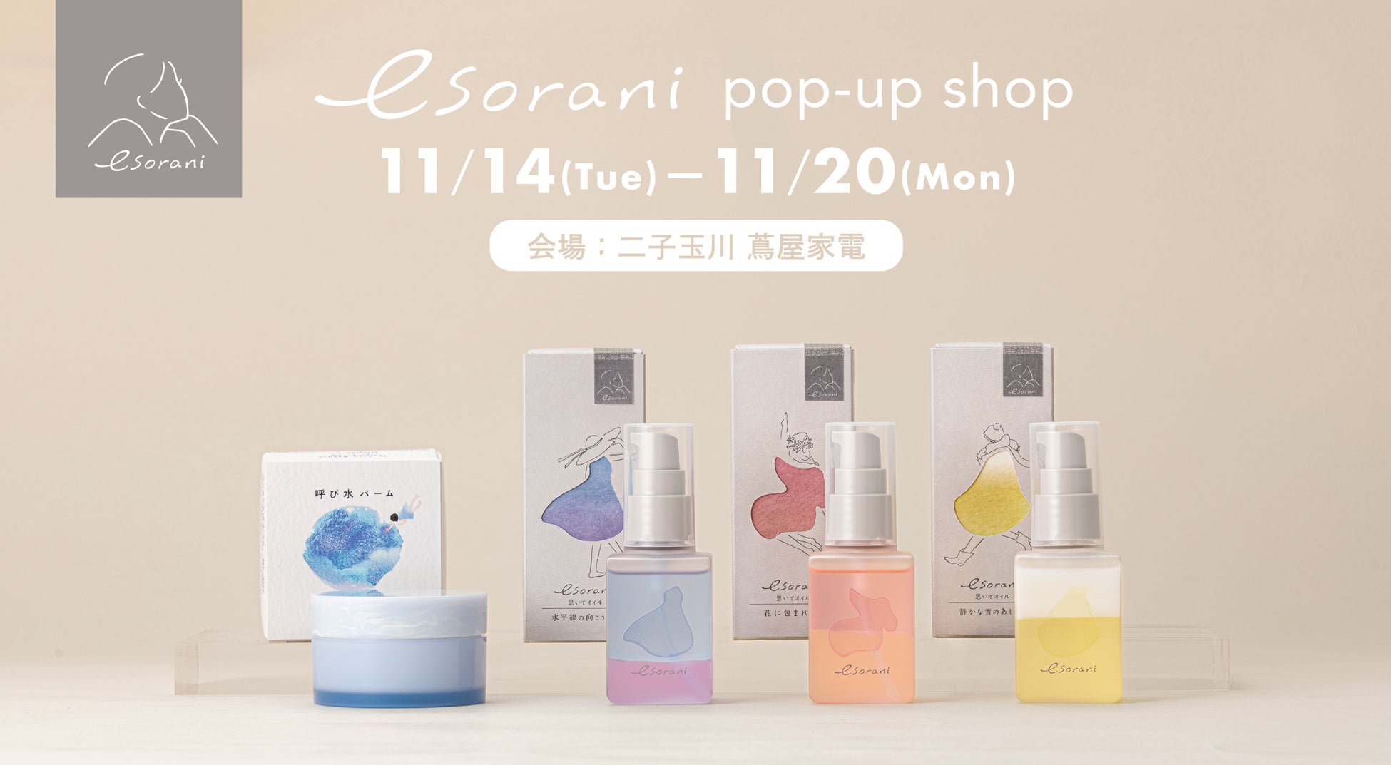 「esorani(エソラニ)」は、日本の四季や景色・伝統などから新しい着想を得ながら、“心と肌に心地よい”をテーマに作られたコスメブランドです。通常はオンラインでしか買えない「esorani」のフルラインアップを、たくさんの方にお試しいただきたく、「二子玉川 蔦屋家電」に期間限定で出店いたします。この機会にぜひ、香りや質感、肌触りやパッケージなどのこだわりが詰まった商品を、五感を通してお楽しみください。