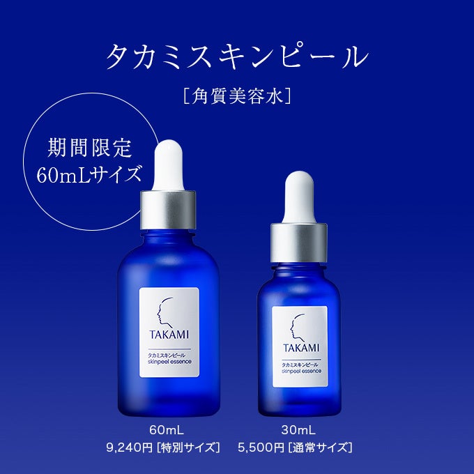 ブランド ロングセラー角質美容水「タカミスキンピール」の通常の2倍となる60mLのビッグボトルを中心に、「角質美容」習慣のために欠かせないアイテムの特別プレゼントをご用意いたします。