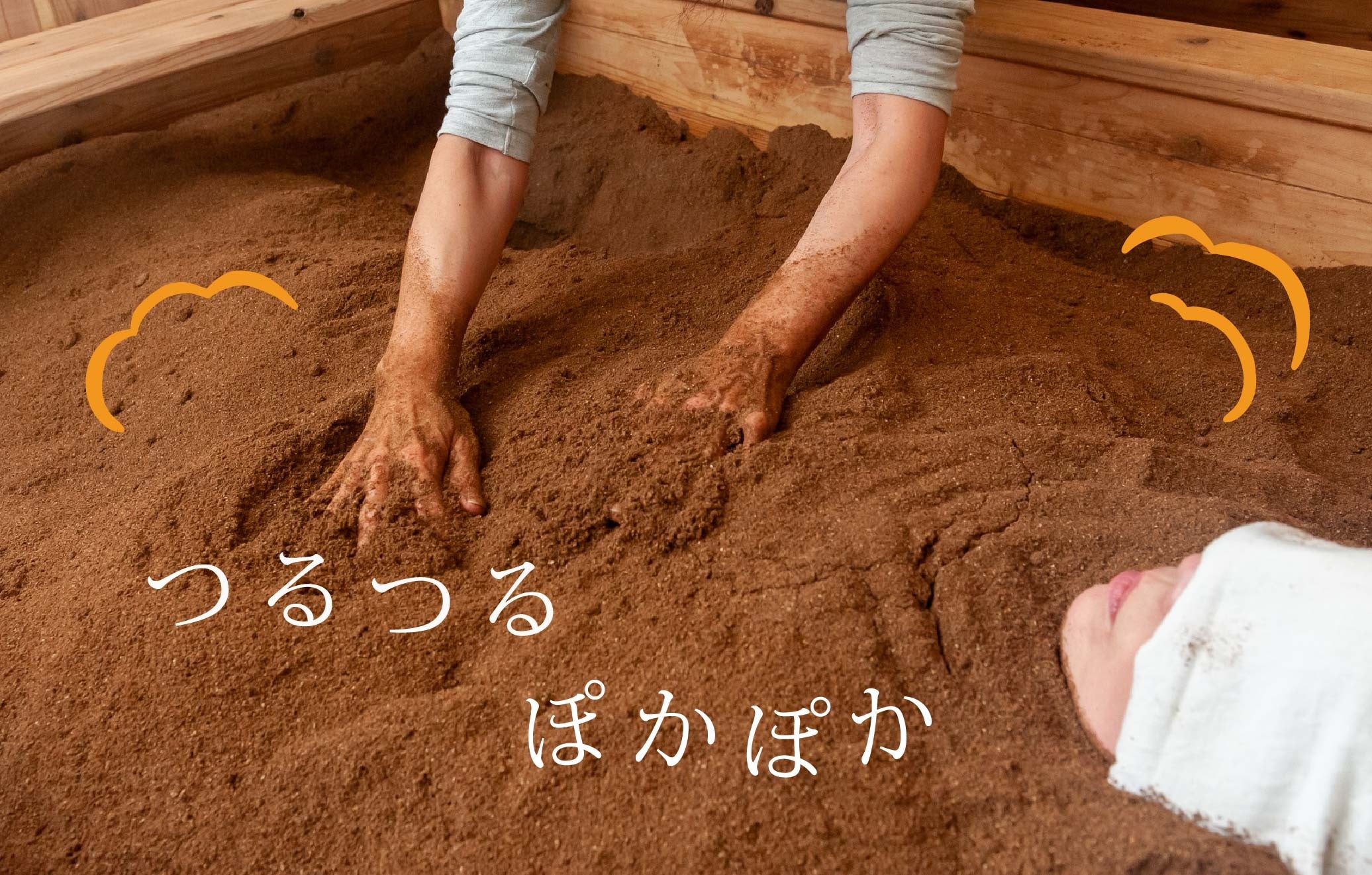 発酵した米ぬかやおがくずの中に体全体を入れて、発酵熱により身体を芯から温める入浴法。