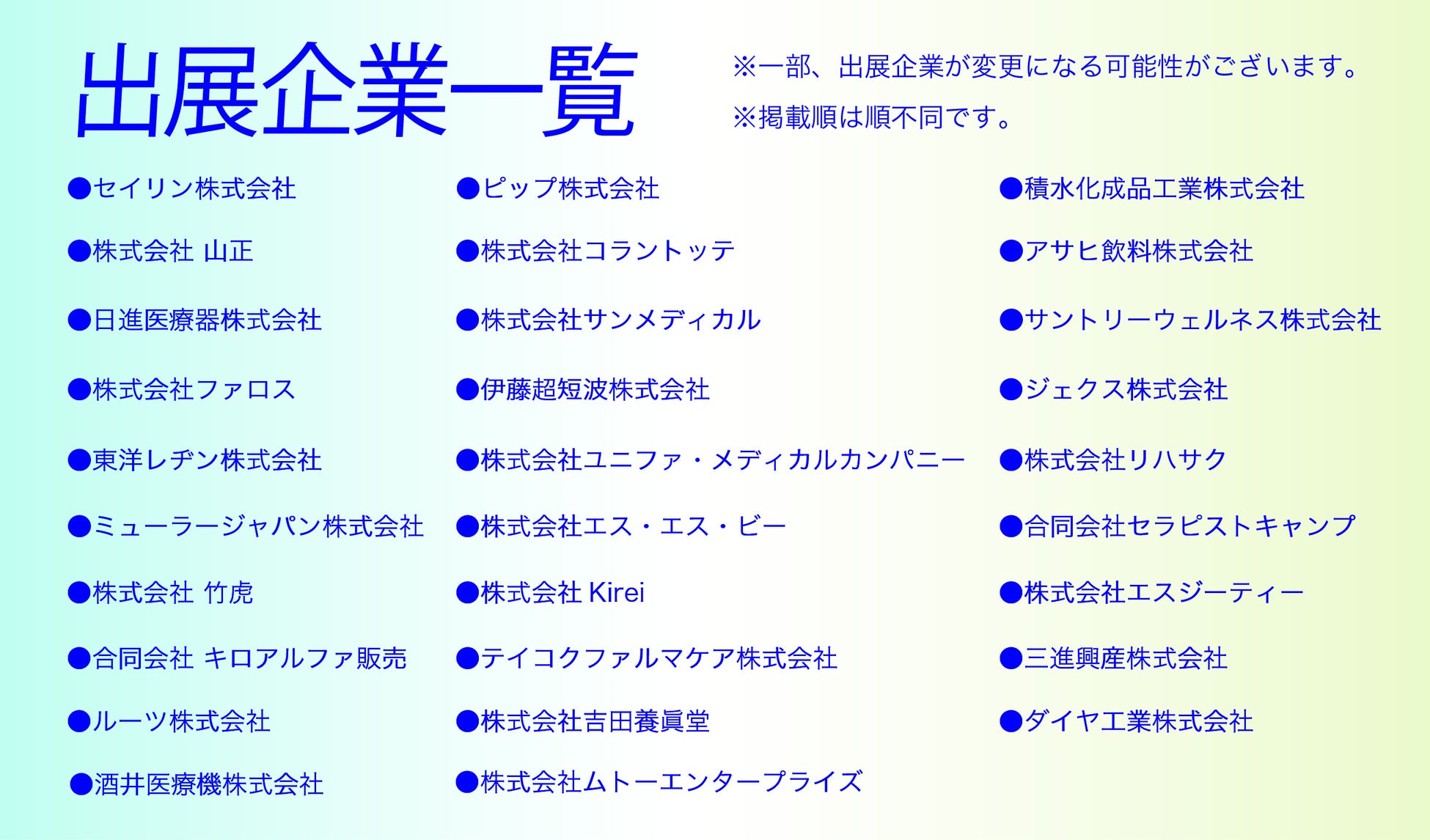 当社が主催する柔道整復師・鍼灸師のための展示商談会です。当日は出展メーカーの新商品や人気商品の展示を行うだけではなく、豪華な講師陣をお招きし、当日限定の特別セミナーを開催いたします。入場の事前予約については、当社のWEBサイト等で受付を行っております。皆さまのご来場をお待ちしております。※柔道整復師・鍼灸師限定のイベントです。
