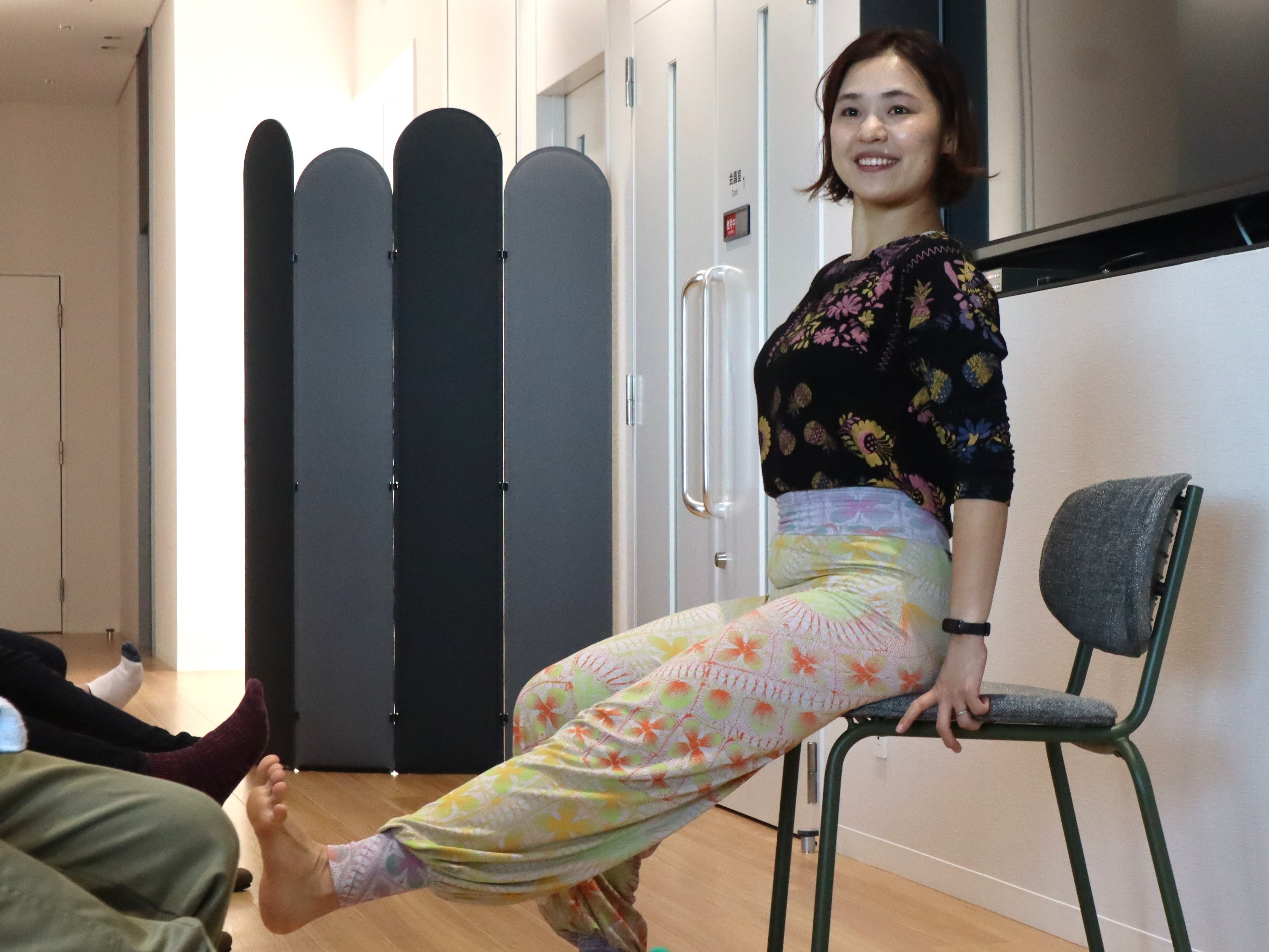 ヨガインストラクター 小中千恵様をお招きし、椅子に座りながら行う『チェアヨガ』を皆様に体験いただきました。ヨガ初体験の方や体が硬いという方でも簡単に始めることができるヨガです。「普段どのように体が動いているのか」「体のどの部分が伸びているのか」「どのような呼吸をしているのか」に意識を向けることで、今のご自身の気分や体の状態を感じることができます。