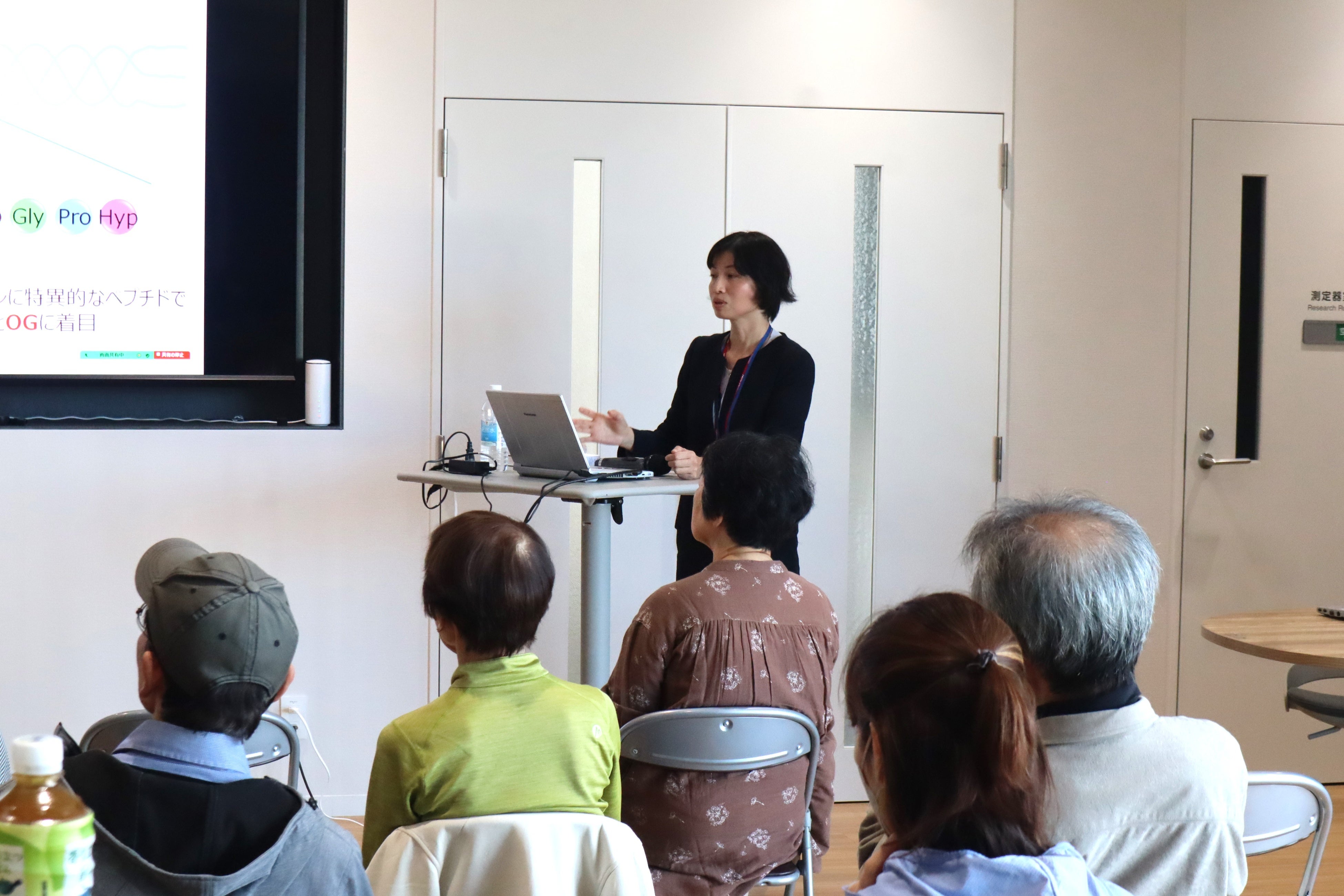 また弊社コラーゲンペプチドの中でも「TYPE-S」という低分子コラーゲンペプチドの肌へのうるおいと弾力のヒト試験結果についても、試験概要や作用機序と併せて、研究員から説明していただきました。