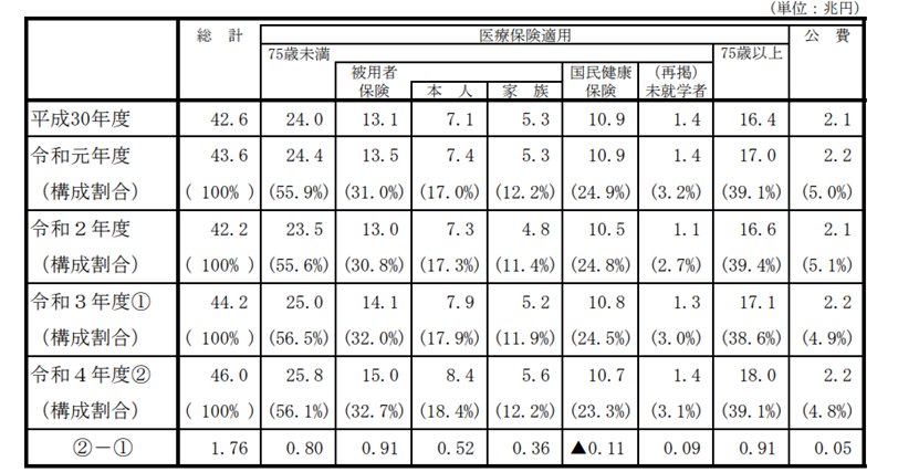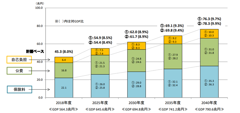 医療費の実績は下記の通り、2022年度は計46兆円と2018年度比約3.4兆円の増加となり(図1 厚生労働省 令和4年度 医療費の動向より)、2040年度には計76兆円~78兆円となることが予想されています(図2 厚生労働省 平成30年発表 医療費の将来見通しより)。